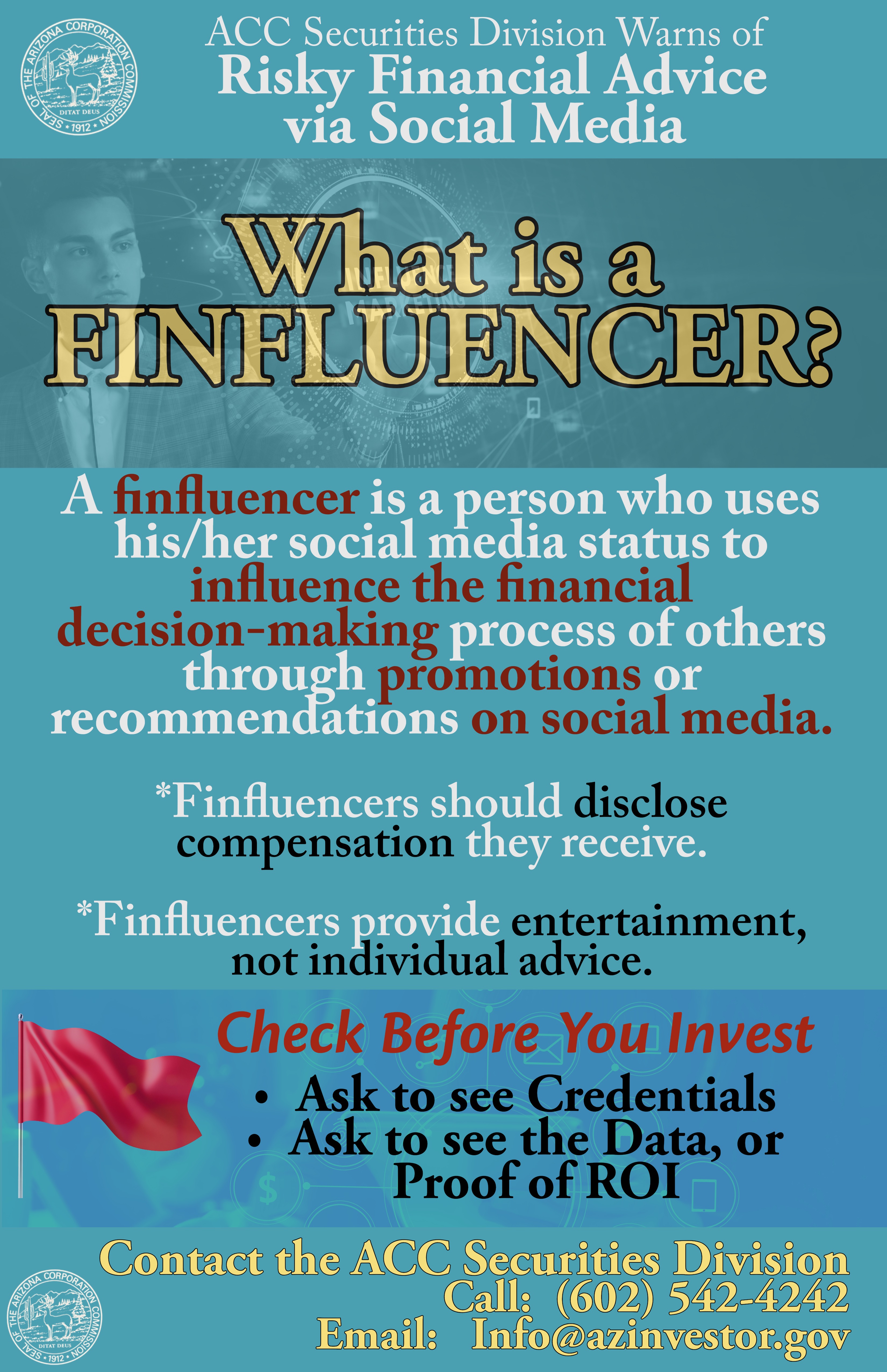On social media, be aware of the "Finfluencers" and understand that it's mostly entertainment. Make sure you get details in writing on how and when the promoter will return your investment. Get a trusted third party who knows about investments to review the data. Ask and check before you invest! Contact your state securities regulator at the Securities Division by telephone at 602-542-4242 or by email at info@azinvestor.gov.