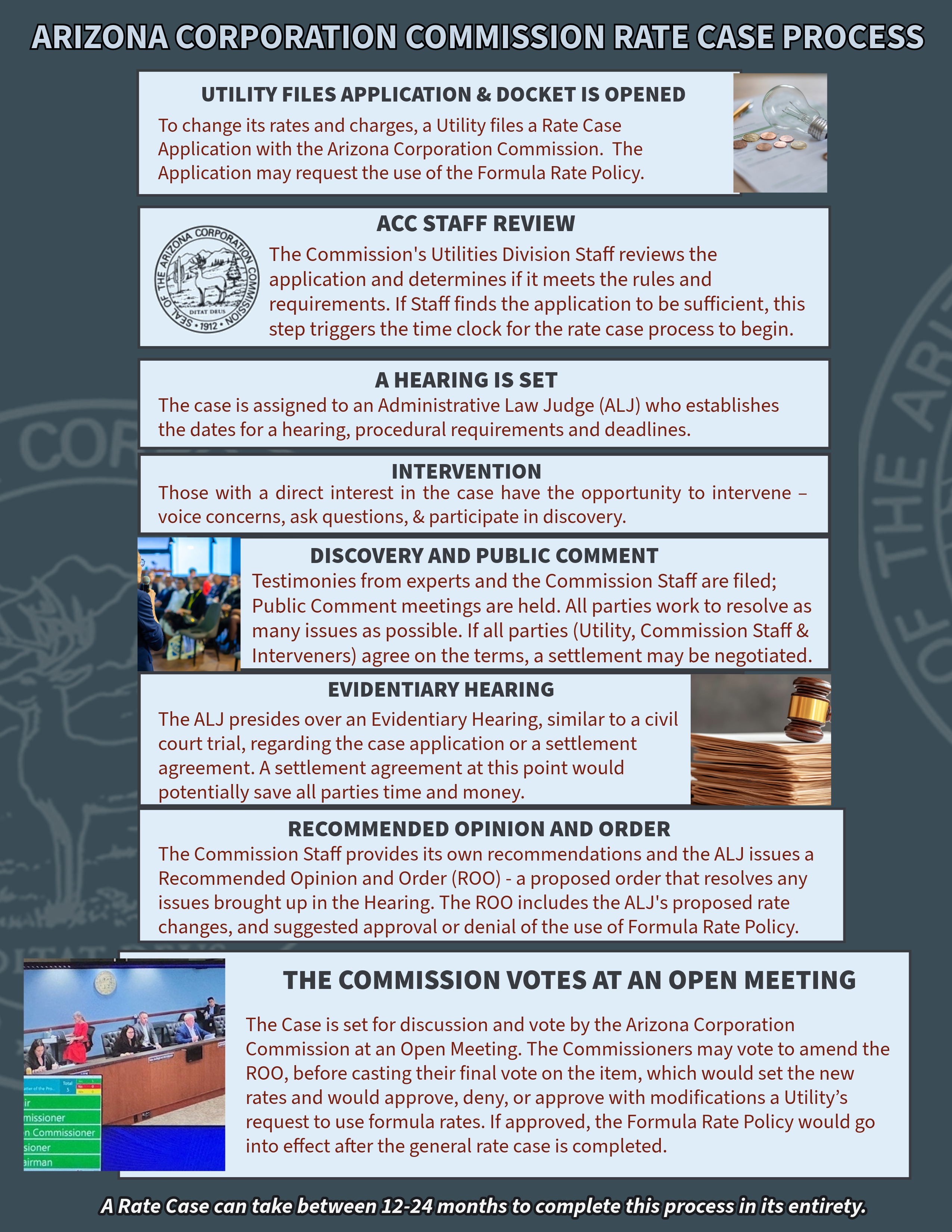 Phoenix, Ariz. — The Arizona Corporation Commission is committed to encouraging public participation in the ratemaking process by sharing timely and transparent updates. Understanding the accounting principles and complexities behind ratemaking is also essential to help customers see how rates are calculated.